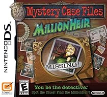 Spot Clues to Find the rightful Heir! It takes a keen set of "private eyes" to identify the heir in this search-and-solve detective story. Mystery Case Files: MillionHeir presents a new generation of search-and-solve games for a new generation of Nintendo DS owners. Whether you like to play for minutes at a time or hours a day, Mystery Case Files: MillionHeir has your game experience covered. Delve into the latest evolution of search-and-solve fun! The game showcases highly detailed interactive scenes in which players look for cleverly hidden items in order to solve the case, an experience made for the added ease and interaction of stylus controls. With Nintendo DS specific controls and activities, Mystery Case Files: MillionHeir takes a bold step into the Touch Generations with an all-new game in the accomplished Mystery Case Files series. Unique Nintendo DS-specific features! Mystery Case Files: MillionHeir includes intuitive touch screen control using assistance items like an X-Ray scanner, flash light and more. All-new interactive objects and hands-on sleuthing like dusting for finger prints deepen the experience. There are 12 potential heirs to investigate, 30 detailed scenes to peruse, and over 1,000 hidden objects to find. Playing With Friends! Mystery Case Files: MillionHeir is the only Mystery Case Files game to include multi-player options. In multi-player modes players can search for clues together or compete against each other in real time. Mystery Case Files: MillionHeir also includes game-sharing DS Download Play so friends and family can share the experience.